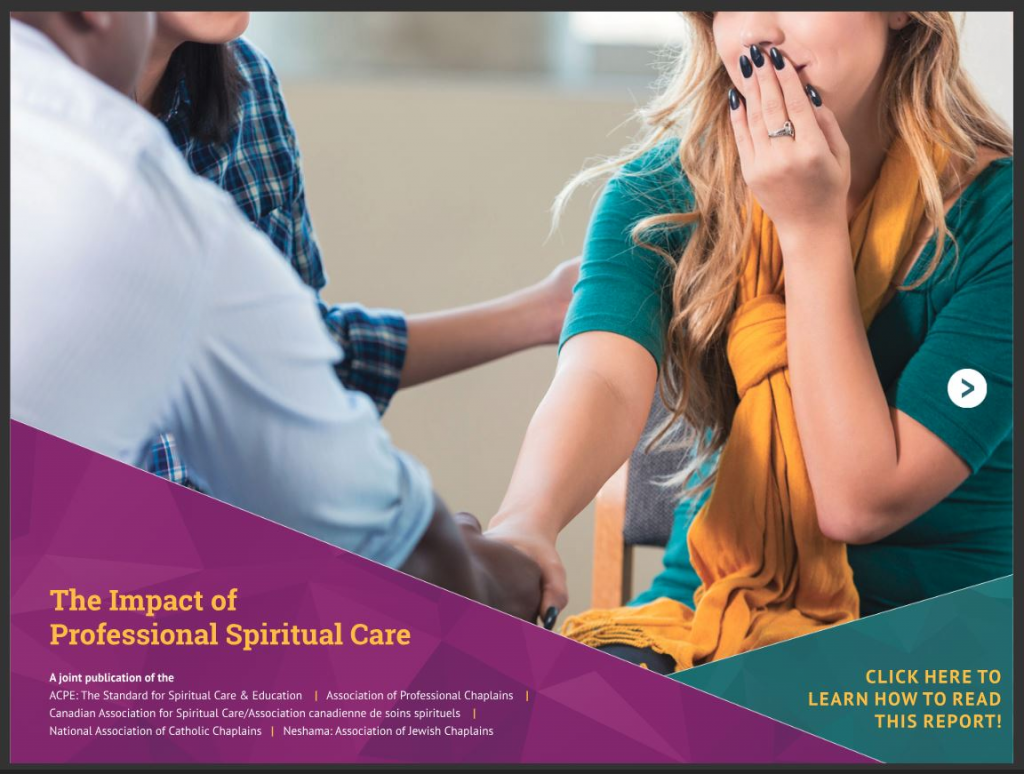 This current resource, entitled The Impact of Professional Spiritual Care, has been co-authored and co-published by our five associations to provide you the most current expressions of and research on the profession of chaplaincy and spiritual care in the United States and Canada in a very accessible and readable format so that you can utilize the materials for yourself, and for your staffs, associates, and executives to explain and advocate for our profession.